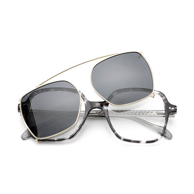 The ClipShine clip-on frame blends fashion and daily ease in one design. Its square full-rim acetate build gives a modern look, while the gold metal clip-on adds a bold touch. Small stud accents on the front corners make the frame unique, giving it extra detail that catches the eye. Indoors, use it as eyeglasses; outdoors, snap on the tinted clip for instant sunglasses.