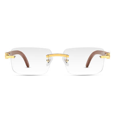 Orvion is a rimless rectangle frame that mixes strong metal with real wood for a style that feels both modern and warm. The gold front adds a rich touch, while the smooth wood temples bring natural charm.