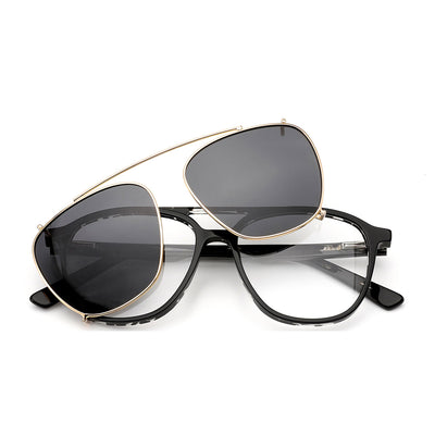 The SunSnap frame offers a mix of bold aviator design and practical ease. Made from durable acetate, it features a full-rim build with a strong bridge for extra stability. The gold-rimmed clip-on allows you to switch instantly from eyeglasses to sunglasses, giving a smooth balance between style and daily function. Its medium size and clean lines make it a reliable choice for everyday wear.